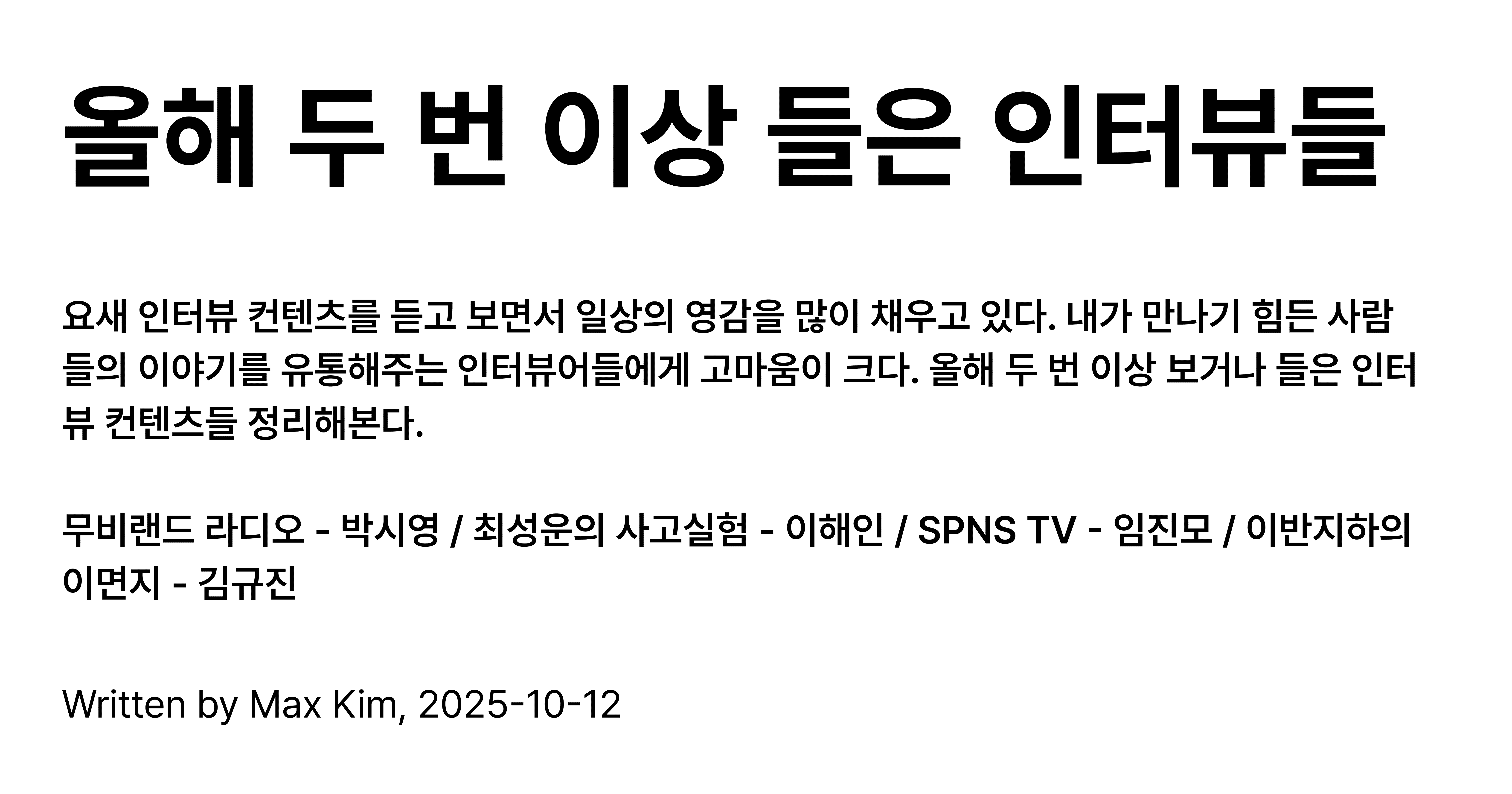 요새 인터뷰 컨텐츠를 듣고 보면서 일상의 영감을 많이 채우고 있다. 내가 만나기 힘든 사람들의 이야기를 유통해주는 인터뷰어들에게 고마움이 크다. 올해 두 번 이상 보거나 들은 인터뷰 컨텐츠들 정리해본다.